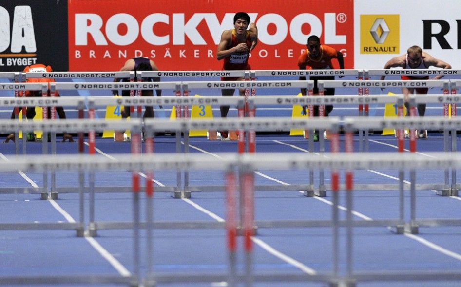 2月23日,在瑞典斯德哥爾摩進(jìn)行的室內(nèi)田徑賽男子60米欄比賽中,中國選手劉翔因搶跑被取消比賽資格,古巴選手羅伯斯以7秒66的成績獲得第一名。圖為劉翔在比賽中搶跑。馬寧攝 圖片來源:新華網(wǎng)
