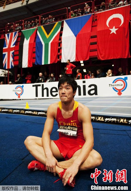 2月23日,在瑞典斯德哥爾摩進(jìn)行的室內(nèi)田徑賽男子60米欄比賽中,中國選手劉翔因搶跑被取消比賽資格,古巴選手羅伯斯以7秒66的成績獲得第一名。圖為劉翔一臉遺憾坐在地上。
