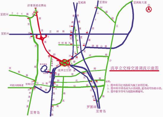????6、即墨沿青威路入市內(nèi)方向,繞行新青威路 、204國(guó)道、鐵騎山路、王沙路至黑龍江路、重慶北路。 (記者 王磊) |