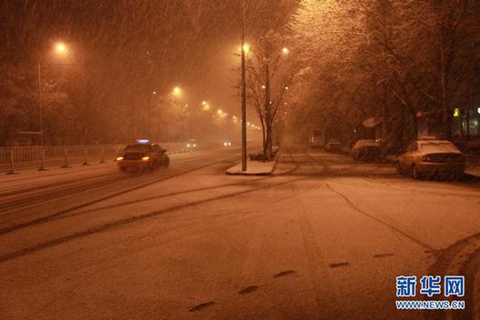 3月18日凌晨,一輛出租車行駛在雪中的北京街頭。 3月17日深夜至18日凌晨,北京意外地迎來一場降雪。 新華社發(fā)(張可任攝)