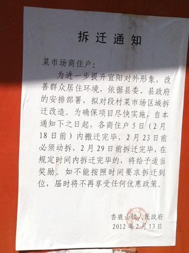 ![]() 圍擋內墻上的“拆遷通知” ????4月1號上午8點,記者在河南宜陽縣香鹿山鎮(zhèn)錦屏大道菜市場附近看到,原本臨街的一排商鋪被藍色的圍擋包圍起來,圍擋足有6米多高,只留有一個很小的開口供居民們通過。當地商戶認為這是鎮(zhèn)政府逼迫居民搬遷的手段,屬于強拆行為。而香鹿山鎮(zhèn)主抓拆遷的副鎮(zhèn)長田振民接受采訪時對居民的指責矢口否認,稱設置圍擋是“為了迎接省里面的領導來視察”。 ????4月1日,記者在河南宜陽縣香鹿山鎮(zhèn)錦屏大道菜市場附近看到,原本臨街的一排商鋪被6米高藍色的圍擋包圍,圍擋里的墻上還貼著拆遷通知,上面寫明要商住戶在2月29日前搬遷完畢。不過,事隔一個多月,商住戶們一直沒有搬遷。 ????當地居民告訴記者,當地政府要在此處規(guī)劃建設高層,需要讓附近居民搬遷。搬遷就少不了賠償問題,可是鎮(zhèn)政府一直讓先拆遷再賠償,并沒有向商住戶提供安置保障、也不簽賠償協議,商住戶們擔心賠償難落實便一直沒有搬遷。 ????房東李先生在采訪時說,這些圍擋是3月中旬安裝的,也是為了能讓他們快速搬遷,鎮(zhèn)政府把門面房與街道隔開,原本1個月能賺2000元的商鋪,現在做生意的人都走光了。就在鎮(zhèn)政府設置圍擋當天,商住戶們與施工人員理論時發(fā)生了沖突,還有一名商住戶被打傷。 ????對于拆遷一事,商住戶們普遍認為雖然政府沒有強制拆除房屋,但是這種強行在門前設置6米高墻,給商住戶工作、生活帶來不便的手段,應該也屬于強拆行為。為此,商戶們曾多次去縣、市信訪辦尋求幫助,可遲遲沒有結果。 ????隨后,記者在香鹿山鎮(zhèn)政府了解到,該處拆遷確有其事。不過,對于讓商住戶“先拆遷再賠償”、“暴力拆遷、打人”等說法,主抓拆遷的副鎮(zhèn)長田振民矢口否認。而對于設置6米圍擋的原因,田振民的解釋是:“設置圍擋是經過鎮(zhèn)里面同意的,是為了迎接省里面的領導來視察?!?/p> |