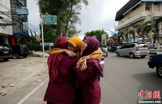 北京時間2012年4月11日下午,印度尼西亞北部蘇門答臘西海岸發(fā)生里氏8.7級地震,震源深度33公里。圖為印尼亞齊省班達亞齊的民眾抵達安全區(qū)域后相擁。