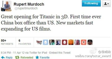 默多克Twitter 部分網(wǎng)友微博摘錄: 尐z_豬:“你跳我也跳”“相信我”“我相信你”真感人??!姐就哭了半包紙巾。 追風(fēng)箏-Mia:聽著my heart will go on,腦袋里面全是昨晚《泰坦尼克號》的場景,看電影時滿滿的感動、滿滿的震撼,電影結(jié)束的時候真想賴著不走,就坐在那里好好哭一場…… 就是二喵Celia:昨晚看泰坦尼克號,哭得都有點虛脫了, Vikki仔是pisces要睥睨天下:昨天晚上看泰坦尼克號哭的那個悲痛欲絕…整個電影院可能都聽到我的哭聲了…真是丟人。謝謝你一直陪著我~終于可以跟你在一起了。 晚霞很美_:我一直在想'如果我在泰坦尼克號上會是怎樣的后果,會有個人愿意為了我的生存而犧牲嗎?找個真心愛你的人不容易,好好珍惜身邊人,在世界末日來臨之前不要讓自己后悔 @回憶里翻滾好久沒哭過了,今天哭得好爽。 Lucy盧倩:《泰坦尼克號》令我最感動的不是“You Jump I Jump”而是最后女主角所說的那句話“我甚至連他的一張照片都沒有,他只活在我的記憶。” v騎馬去兜風(fēng)v:#那年的泰坦尼克號#記得最后媽媽摟著孩子們唱著搖籃曲覺得感動。如今兩個孩子媽媽的我一定會哭。 滄海云蝶:十五年前的我看《泰坦尼克號》雖然不知道看懂看不懂,哭的稀里嘩啦;十五年后再看,仍舊哭的稀里嘩啦,因為此刻我好像明白了愛情的真正涵義。 |