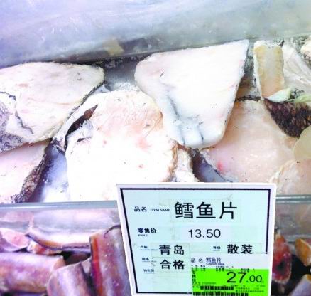 18日下午,記者來到市南區(qū)某超市,在二樓的水產(chǎn)區(qū)轉(zhuǎn)了一圈后發(fā)現(xiàn)超市冷柜里的確有一塊區(qū)域放置了鱈魚,產(chǎn)品名字寫的是鱈魚片,上面的標(biāo)簽是13.5元/斤,并且標(biāo)著產(chǎn)地是青島。這些鱈魚片看上去肉色偏黃,似乎被冷凍過很長時間。記者以消費者的身份詢問在場的工作人員這鱈魚怎么這么便宜?工作人員回答說:“一直差不多這價格,這魚又不貴”。