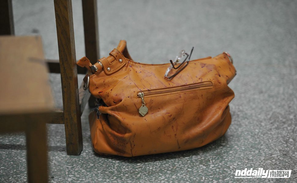死亡女子的挎包和眼鏡??姘蠞M是血跡。