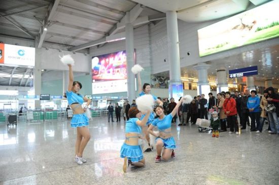 為穩(wěn)定旅客情緒,大連機(jī)場(chǎng)請(qǐng)來(lái)美女拉拉隊(duì)員跳操,引來(lái)眾多旅客圍觀。