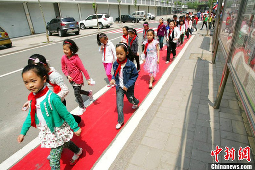 2012年5月2日,山東省濰坊市勝利東小學(xué)的學(xué)生放學(xué)走在“學(xué)生專(zhuān)用通道”上。為保障學(xué)生出行安全,日前,山東省濰坊市交警部門(mén)在這所學(xué)校門(mén)前設(shè)置了一條長(zhǎng)約100多米的彩色“學(xué)生專(zhuān)用通道”,各類(lèi)車(chē)輛都不得占用該通道,阻礙學(xué)生上下學(xué)通行,以保證學(xué)生出行安全。