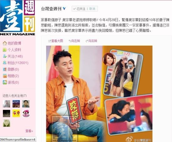 臺媒微博截圖 2012年4月29日,臺灣媒體報道金鐘影帝庹宗華對結(jié)婚10年的妻子陳思動粗,陳思還跑到派出所報案,并去驗傷,引爆娛樂圈又一宗家暴事件。5月9日,臺灣壹周刊發(fā)布微博,稱這已非陳思首次挨揍,雖然庹宗華表示將盡力挽回婚姻,但陳思已鐵了心要離婚。 庹宗華和小他15歲的上海女孩陳思于2002年4月21日結(jié)婚。當初因兩人年齡差距甚大,陳思父親一度不同意這樁婚姻。兩人幾經(jīng)波折,才獲陳父點頭應(yīng)允,步入婚姻殿堂?;楹箨愃茧S庹宗華定居臺灣,育有兩女。在熒幕前夫妻倆總是百般恩愛,未料私底下竟是驚濤駭浪。 庹宗華此次再度動手毆打老婆陳思后,曾通過經(jīng)紀人表示懊悔,并透露太太已回家,雙方會好好溝通。庹宗華當時還強調(diào)“她說離婚是氣話,沒什么事比小孩更重要,我真的很后悔?!钡裉炫_媒曝光陳思遭受家暴脖子被勒傷,還發(fā)布陳思摟著友人痛哭落淚的照片,稱其鐵了心要離婚。 |