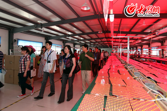 ![]() 采訪團(tuán)記者在車間內(nèi)參觀LED燈制造工藝。(盛堃 攝影)