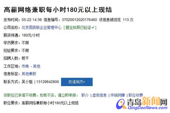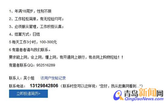 ??? 小李繼續(xù)回憶道:“ 于是,我照著她說的做了,先做了兩筆網(wǎng)購共計700元,可操作成功后兩小時內(nèi)對方都沒有一點回款的動靜,我便在qq上催她,對方說稍等,后來我等不及就撥打了頁面上的電話,這才知道這電話根本不是青島的,而是廣東東莞的一個號碼,并且接電話竟然是個男人,他說不知道我說的是什么,口氣也很不好,并說自己根本就不認(rèn)識姓吳的。無奈之下,我又詢問了頁面上出現(xiàn)的公司,對方稱這個聯(lián)系方式不是他們公司的,他們曾在去年發(fā)布過這種信息,而現(xiàn)在具體情況他們也不清楚,現(xiàn)在根本就不承認(rèn)發(fā)布過這條招聘,聲稱現(xiàn)在公司早已撤銷該頁面信息?!?/font>