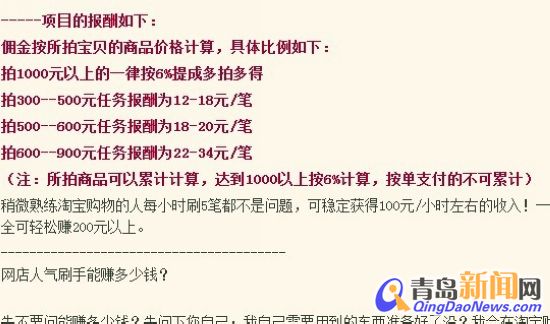 ??? 青島新聞網(wǎng)訊 近日,本網(wǎng)記者接到網(wǎng)友投訴舉報,稱自己在趕集網(wǎng)上搜索到的一份兼職工作,竟然是條詐騙信息。據(jù)當(dāng)事人小李描述,他的兼職就是用自己淘寶賬號里的錢幫賣家沖人氣,而交易兩筆成功后,小李的700元錢就在彈指間不見蹤影,對方也在騙到錢后迅速“消失”。被騙后,小李對記者說,他后悔當(dāng)初