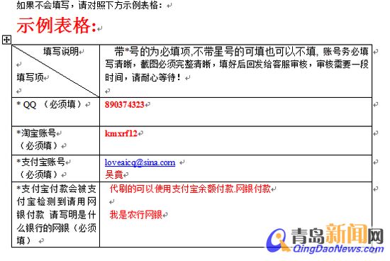 ????5月22日,記者采訪了當(dāng)事人、還在讀書的研究生小李。他講述道:“那天,我在趕集網(wǎng)上搜到這樣一份兼職工作,說讓我做刷手,靠為淘寶店家沖人氣來賺些辛苦費,于是我加了頁面上顯示的一位吳小姐的qq咨詢情況,她先讓我填寫了一份申請表,表中包括我的淘寶賬號信息,我填好表后發(fā)回去給她,她介紹說這份工作就是給淘寶刷人氣,按小時結(jié)算工資,具體說就是給游戲賬號充值,要先用我的錢在淘寶上買張游戲充值卡,然后他們給我一個游戲賬號,我充值到那個游戲賬號里,最后等待淘寶賣家把我所充的錢與刷人氣的辛苦費再打回到我的卡里?!?/font>