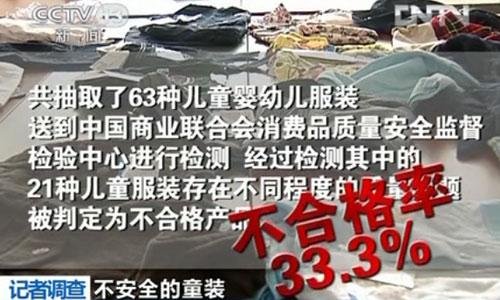 中國商業(yè)聯(lián)合會消費品質(zhì)量安全監(jiān)督檢驗中心檢測結(jié)果顯示,經(jīng)過檢測其中的21種兒童服裝存在不同程度的質(zhì)量問題,被判定為不合格產(chǎn)品,不合格率達到33.3%。(視頻截圖)