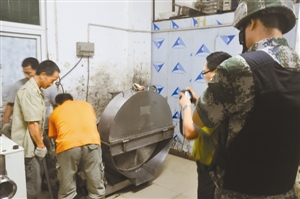 執(zhí)法人員扣押黑心肉餡廠的生產(chǎn)設(shè)備。
