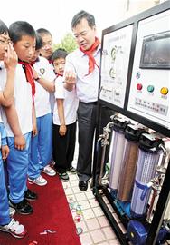 一臺機器完全是透明玻璃制成的,一個玻璃方框里放著一支像船槳似的東西;另一臺機器上則像一臺巨型電表,不同的是,上面有紅紅綠綠的好多按鈕,還有好幾個復(fù)雜的儀表盤。“聽說海水進去了轉(zhuǎn)一圈出來就能直接喝!”孩子們上前把兩部機器圍了個水泄不通,還纏著老師們問東問西??吹綄W??萍祭蠋熡行﹩栴}答不出來,國家海洋局科技司副司長雷波連忙上前充當起了臨時講解員。在雷波深入淺出的介紹下,孩子們五花八門的問題一一得到了權(quán)威答案,這才感到心滿意足。