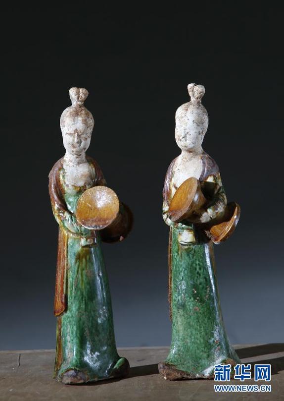 這是河南洛陽(yáng)唐代墓中發(fā)掘出的一對(duì)手持鼓的三彩樂舞俑(2012年6月4日攝)。