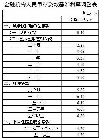 > 正文????中國人民銀行決定,自2012年6月8日起下調金融機構人民幣存貸款基準利率。金融機構一年期存款基準利率下調0.25個百分點,一年期貸款基準利率下調0.25個百分點;其他各檔次存貸款基準利率及個人住房公積金存貸款利率相應調整。