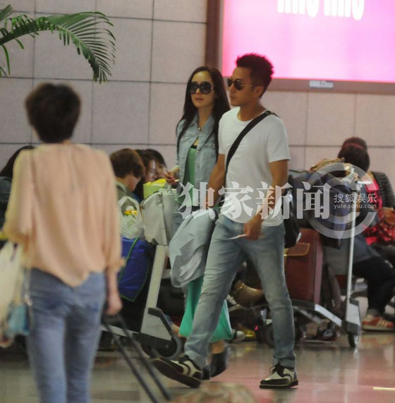 楊冪劉愷威情侶裝現(xiàn)身機(jī)場(chǎng) 楊冪摘墨鏡安檢素顏憔悴