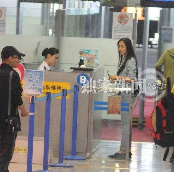楊冪劉愷威情侶裝現(xiàn)身機場 楊冪摘墨鏡安檢素顏憔悴(圖)