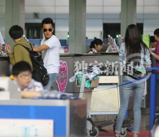 楊冪劉愷威情侶裝現(xiàn)身機場 楊冪摘墨鏡安檢素顏憔悴(圖)