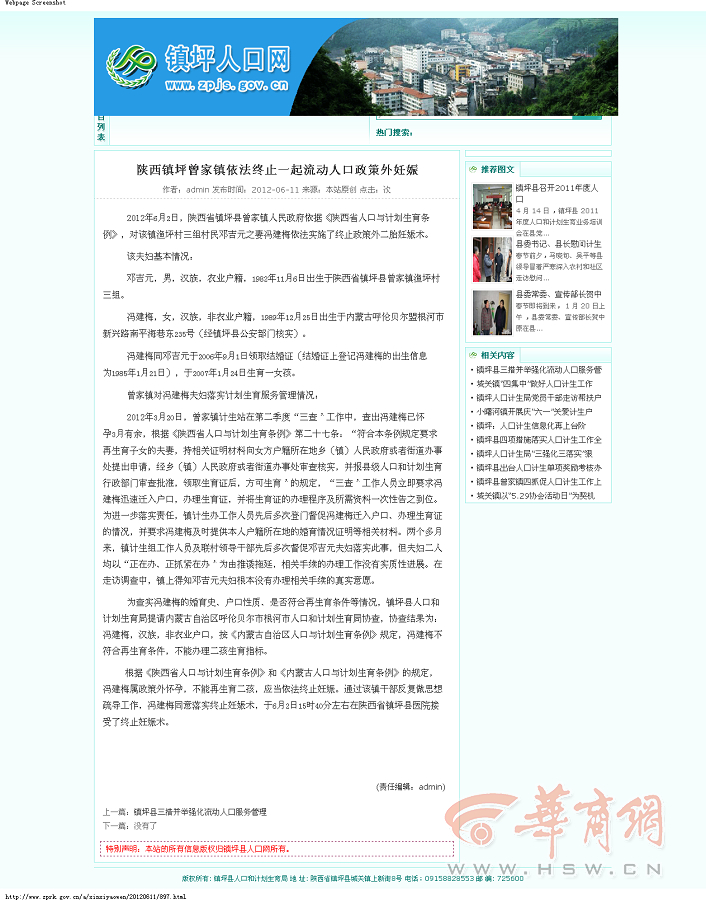 安康一懷孕7個月的母親,在沒有通知家人的情況下,肚中胎兒被強制引產(chǎn)。對此,鎮(zhèn)坪縣人口和計劃生育局在其官網(wǎng)回復,稱該孕婦屬于政策外懷孕。通過該鎮(zhèn)干部反復做思想疏導工作,孕婦同意落實終止妊娠術(shù),并與于6月2日15時40分接受終止妊娠術(shù)。