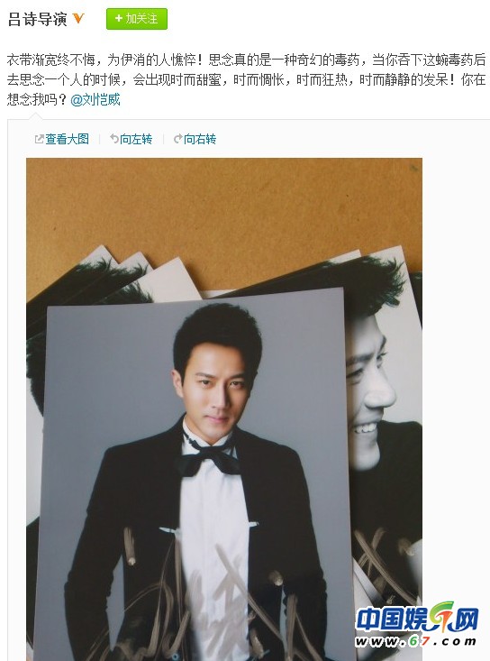 CCTV青歌賽編導(dǎo)、大型文藝晚會(huì)總導(dǎo)演呂詩(shī)在微博上肉麻示愛(ài)劉愷威,呂詩(shī)示愛(ài)“衣帶漸寬終不悔,為伊消的人憔悴!”,對(duì)劉愷威迷戀及遐想,并@給劉愷威的微博,劉愷威至今沒(méi)有回應(yīng),目前劉愷威正與楊冪熱戀,看來(lái)期望男男戀的央視導(dǎo)演呂詩(shī)只能“空悲切”了。