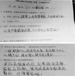 ????圖片上是一張考卷,卷面上寫著2011-2012學年第二學期心理健康學科,2011級16班的黃同學在這張考卷的 “給心理老師的悄悄話”一題中寫下:“老師我很喜歡你,如果能,我還想留級讓你教,等我有房有車就來迎娶你,記得等我哦!”