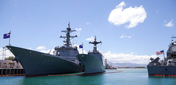 軍演將持續(xù)至8月3日,來(lái)自22個(gè)國(guó)家的42艘艦艇,6艘潛艇,超過(guò)200架飛機(jī)以及2.5萬(wàn)名軍人參加。圖為6月29日,兩艘參加“環(huán)太平洋-2012”軍演的韓國(guó)軍艦(左)停泊在美國(guó)夏威夷的珍珠港-??仿?lián)合基地。