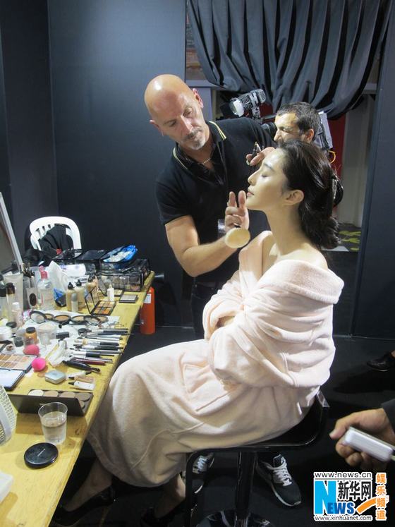 范冰冰巴黎走秀后臺花絮曝光 披浴袍深V露溝化妝(圖)
