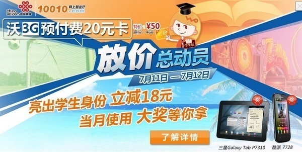 ????據(jù)悉,聯(lián)通網(wǎng)上營(yíng)業(yè)廳() 將于7月11日至12日舉辦 “放價(jià)總動(dòng)員”活動(dòng),所有學(xué)生用戶(hù)填寫(xiě)學(xué)生證號(hào)、高考準(zhǔn)考證號(hào)即可以50元的最低價(jià)格購(gòu)買(mǎi)到原價(jià)68元的20元3G卡套包(含50元通信費(fèi)、免運(yùn)費(fèi))。當(dāng)月使用的用戶(hù)還有機(jī)會(huì)獲得三星平板電腦、酷派7728手機(jī)以及聯(lián)通一卡充等獎(jiǎng)品。