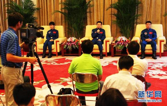 7月13日,航天員景海鵬(中)、劉旺(右)、劉洋在北京航天城航天員公寓與媒體見(jiàn)面。