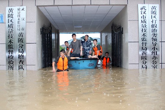 7月13日,武漢遭遇特大暴雨襲擊,幾名男子乘船解困。