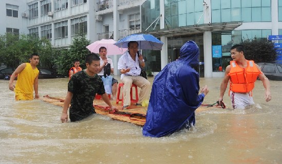 7月13日,武漢遭遇特大暴雨襲擊,幾名男子乘船解困。