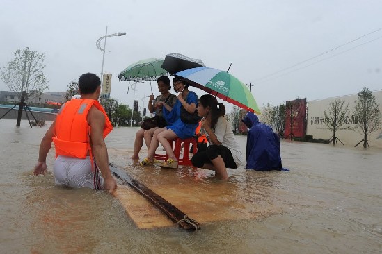 7月13日,武漢遭遇特大暴雨襲擊,市民在水上前行。