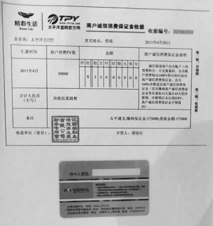 太平洋直購官方網(wǎng)向一名受害者出具的“商戶誠信消費保證金”收據(jù)和會員卡。簡鵬供圖