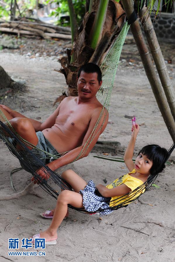 暑假上島的女孩符文蝶(右)與叔公在永興島的漁村納涼(7月21日攝)。