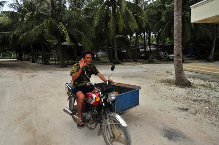 一名村民騎著摩托車從鏡頭前駛過。