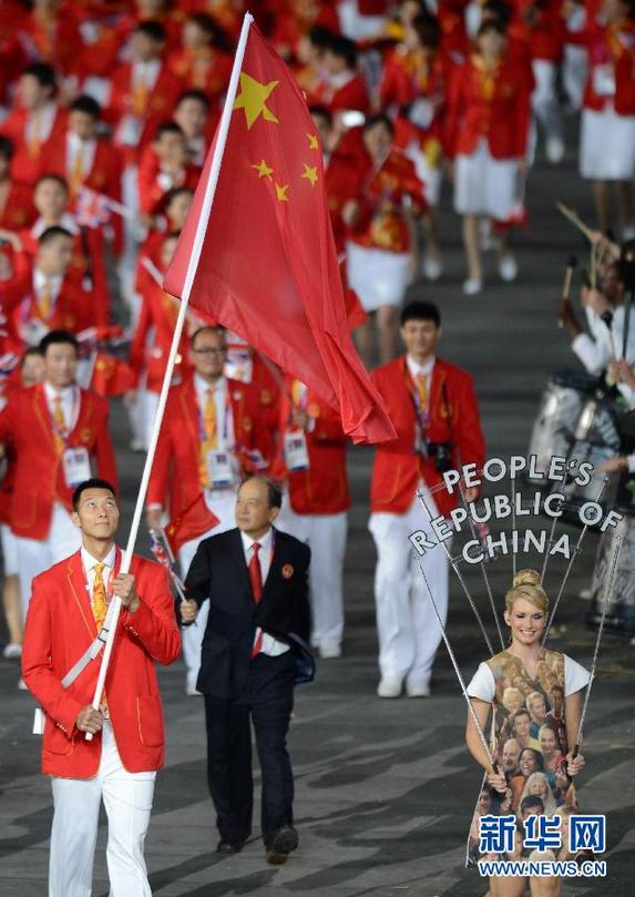 7月27日,第三十屆夏季奧林匹克運(yùn)動(dòng)會(huì)開幕式在倫敦奧林匹克公園主體育場(chǎng)“倫敦碗”舉行。這是中國(guó)代表團(tuán)旗手易建聯(lián)(左前)執(zhí)旗入場(chǎng)。
