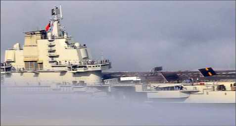 資料圖:瓦良格航母甲板上供艦載機(jī)起降的三塊擋焰板全部豎起。
