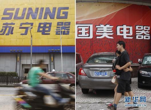 市民從蘇寧和國美位于上海市內的兩家門店前經(jīng)過(8月15日攝,拼版照片)。