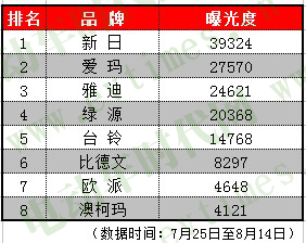 本期電動(dòng)車時(shí)代網(wǎng)對(duì)奧運(yùn)期間(7月25日至8月14日,14日前奧運(yùn)關(guān)注度仍有余熱)電動(dòng)車品牌曝光度進(jìn)行了統(tǒng)計(jì),綜合行業(yè)和社會(huì)媒體主動(dòng)傳播量、消費(fèi)者受營(yíng)銷活動(dòng)、廣告等傳播手段影響,以及主動(dòng)關(guān)注品牌的頻次等指標(biāo),最終新日、愛(ài)瑪、雅迪、綠源、臺(tái)鈴、比德文、歐派、澳柯瑪榮登奧運(yùn)期間品牌影響力排行榜前八名。