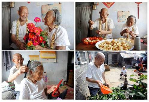 山東99歲的宮德云把親手在庭院里采摘的鮮花送給102歲的妻子孫玉翠,二人共同迎接婚后第83個(gè)七夕節(jié)。這對(duì)夫妻于1930年農(nóng)歷三月結(jié)婚,相濡以沫82載,屬于世界上婚齡最長的“橡樹婚”。老兩口生活能夠自理,每天拾柴燒火,吃飯換衣,養(yǎng)花散步。