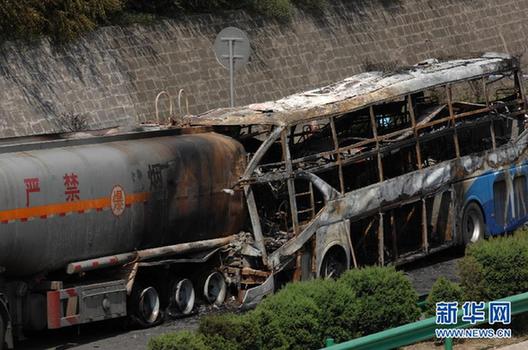 圖為包茂高速陜西延安境內(nèi)發(fā)生的特大交通事故現(xiàn)場(8月26日攝)。