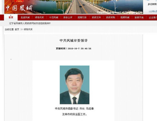 記者檢索遼寧省鳳城市人民政府網(wǎng)站,發(fā)現(xiàn)“領導風采”的“中共鳳城市委領導”欄中沒有市委書記的信息,最上一欄為市委副書記、市長馬延春的照片。