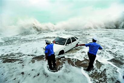 隨著潮位越來越高,至下午1時許,岸邊的海浪已經(jīng)高達(dá)10多米。期間,一個大浪涌來,一輛黑色轎車的保險杠被掀了下來,保險杠隨著海浪被拋出20多米,飛過馬路對面的矮墻落入操場里。此時,站在矮墻高處的市民也被海浪打濕,民警立即將警戒線再往后推移5米,防止大浪傷及市民。一名白色轎車車主此時趕到現(xiàn)場,上車后發(fā)現(xiàn)車內(nèi)已經(jīng)進(jìn)了海水,不敢將發(fā)動機(jī)點(diǎn)火。趁著大浪間隙,兩名民警趕緊涉水趕過去,來不及將車掉頭,推著車頭發(fā)動機(jī)蓋,將車反方向推到安全區(qū)域?!凹佑停 痹诎哆呌^浪的市民此時不約而同地為推車的民警加油叫好。