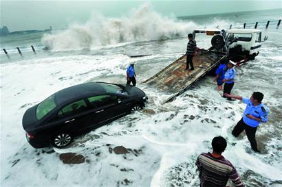 ????下午1時30分,民警調(diào)來一輛拖車,準(zhǔn)備將剩余的被困車輛拖離險境。剛被海浪打飛保險杠的黑色轎車車主趕到現(xiàn)場,車輛進(jìn)水也無法發(fā)動。民警在指揮拖車將黑色轎車拖走時,一個巨浪拍過來,靠近岸邊的一名民警被海浪劈頭蓋臉打濕。路面的海水隨即升高到1米左右,參加救援的民警全都浸泡在齊腰深的海水中。至下午2時30分,海浪開始明顯減小,路面上的車輛也先后被拖到安全區(qū)域。許多車輛進(jìn)水或因海浪沖撞碰傷,車主在路邊整理受損車輛。現(xiàn)場救援的交警此時才陸續(xù)離開。記者了解到,從上午10時開始,這些參加救援的民警連中午飯都沒來得及吃。