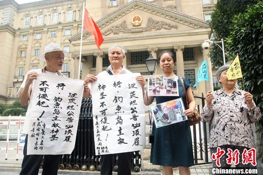 圖為重慶大轟炸受害者在法院大門展示橫幅。