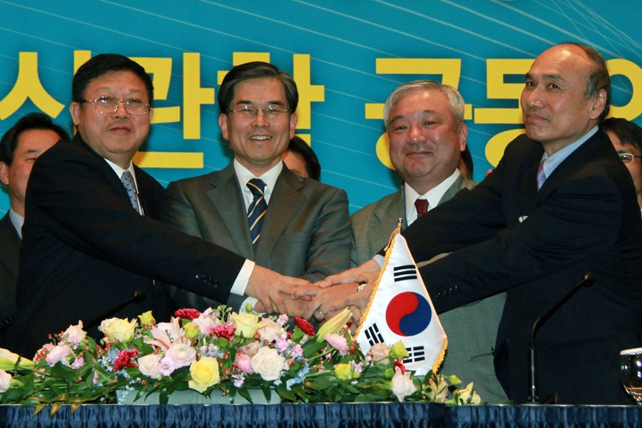 2011年12月16日,韓國(guó)平昌,中國(guó)國(guó)際貿(mào)易談判副代表崇泉(左一)、韓國(guó)外交通商部自貿(mào)協(xié)定談判代表崔晳泳(左二)和日本外務(wù)省外務(wù)審議官西宮伸一(右二)簽署聯(lián)合聲明后握手。新華社/何璐璐