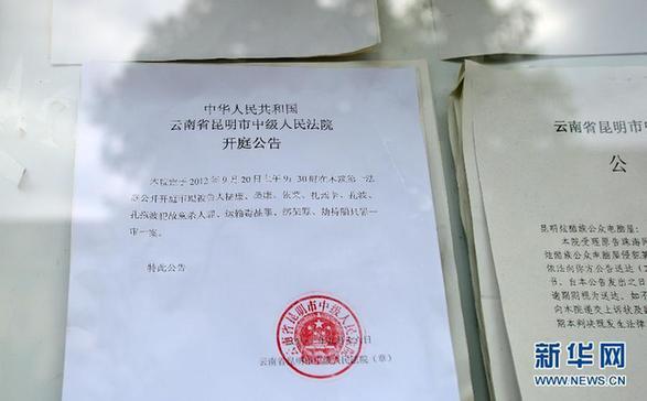 昆明市中級人民法院公告欄中張貼的湄公河“10·5”慘案開庭公告(9月17日攝)。
