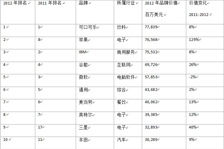 ????Interbrand 2012 最佳全球品牌價值排行榜前十名